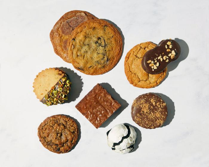 Three Dozen: Belgian Spice "speculoos" cookie (our version of the Biscoff Tim Tam cookie) - 3, Peanut Butter Delight Sandwich Cookie - 3, Dubai Pistachio and Chocolate - 3, and OG Fudge Brownie - 3, Chocolate Chip - 4, Cinnamon Brulee - 4, Oatmeal - Raisin - 4, Peanut Butter - 4, Chocolate Decadence - 4, Chocolate Mint - 2, Chocolate Chip Walnut - 2.