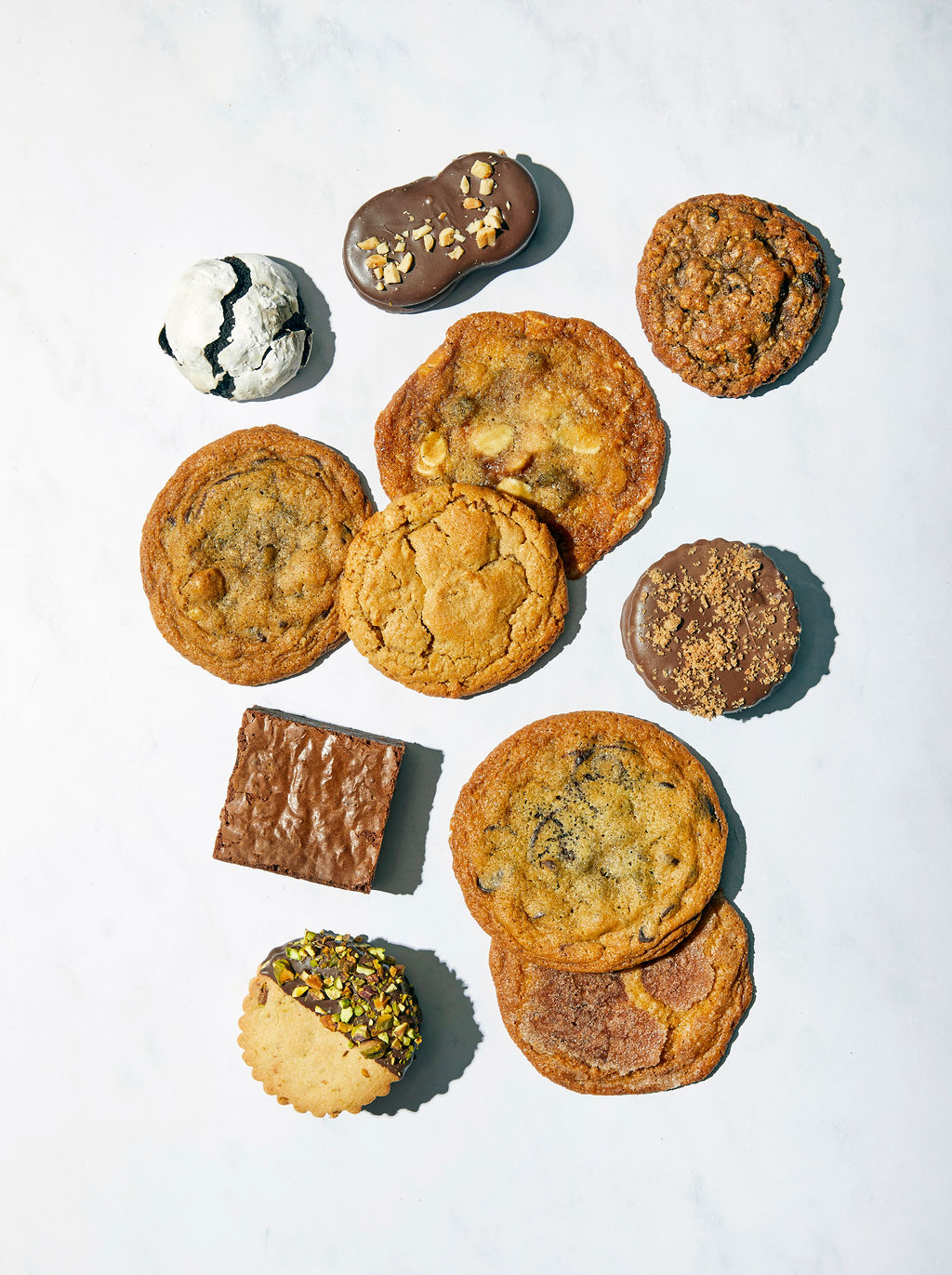 Two Dozen: Belgian Spice "speculoos" cookie (our version of the Biscoff Tim Tam cookie) - 3, Peanut Butter Delight Sandwich Cookie - 3, Dubai Pistachio and Chocolate - 3, and OG Fudge Brownie - 3, Chocolate Chip - 3, Cinnamon Brûlée - 2, Oatmeal Raisin - 2, Peanut Butter - 2, Chocolate Decadence - 3.